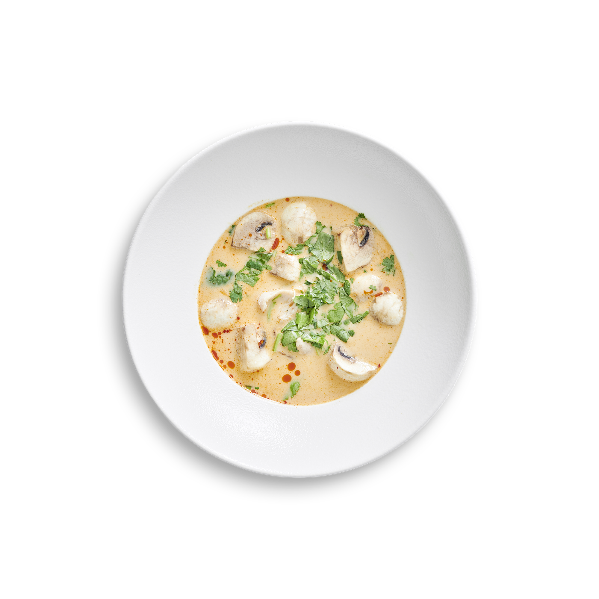 Lækker kokosmælk suppe med limeblade, koriander, galanga og kylling.
