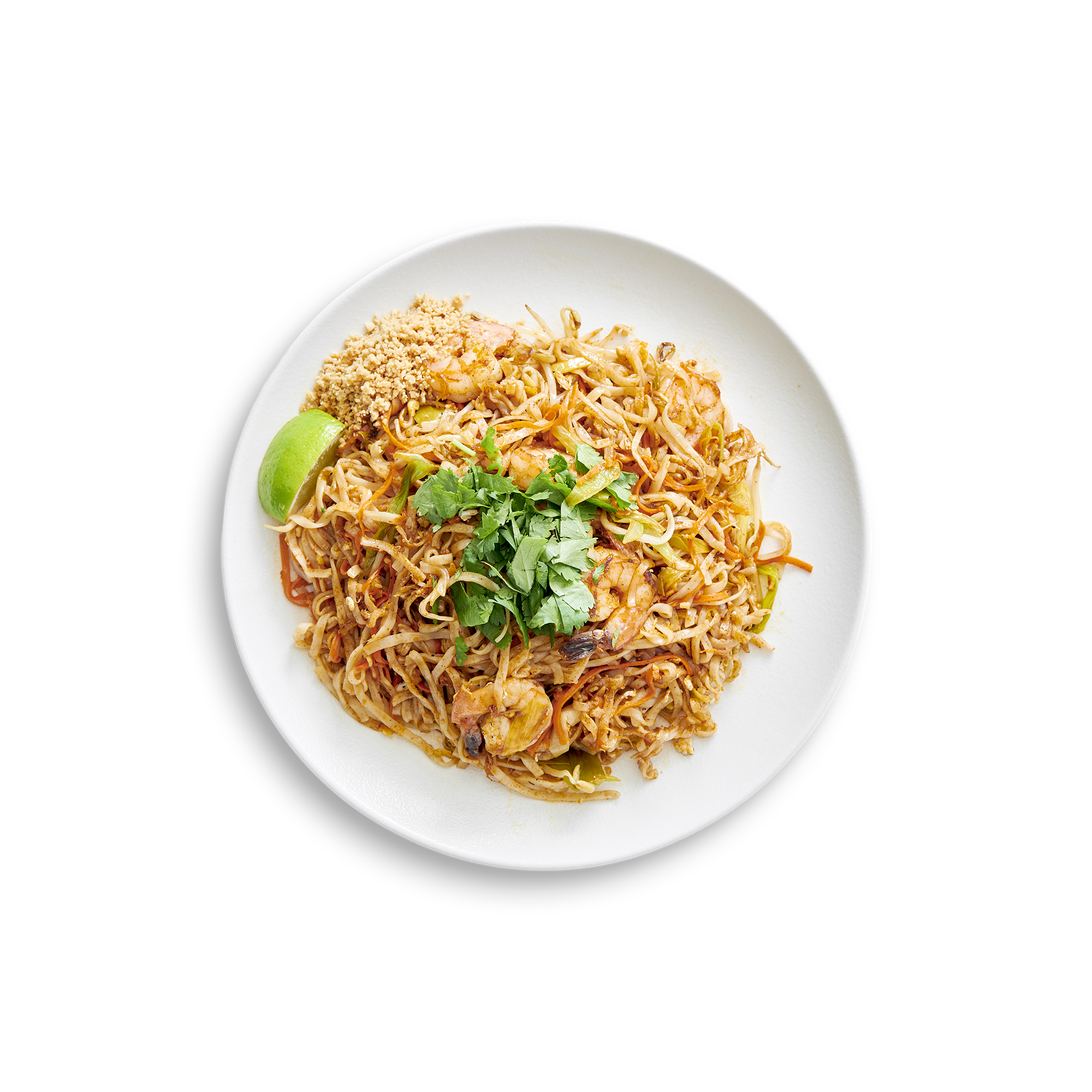 Stegte nudler med kongerejer, bønnespirer, grøntsager, æg og sød soya.