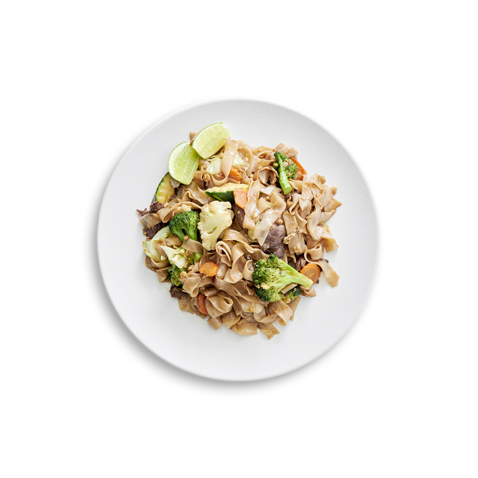 Stegte nudler med oksekød, bønnespirer, grøntsager og æg med sød soya.