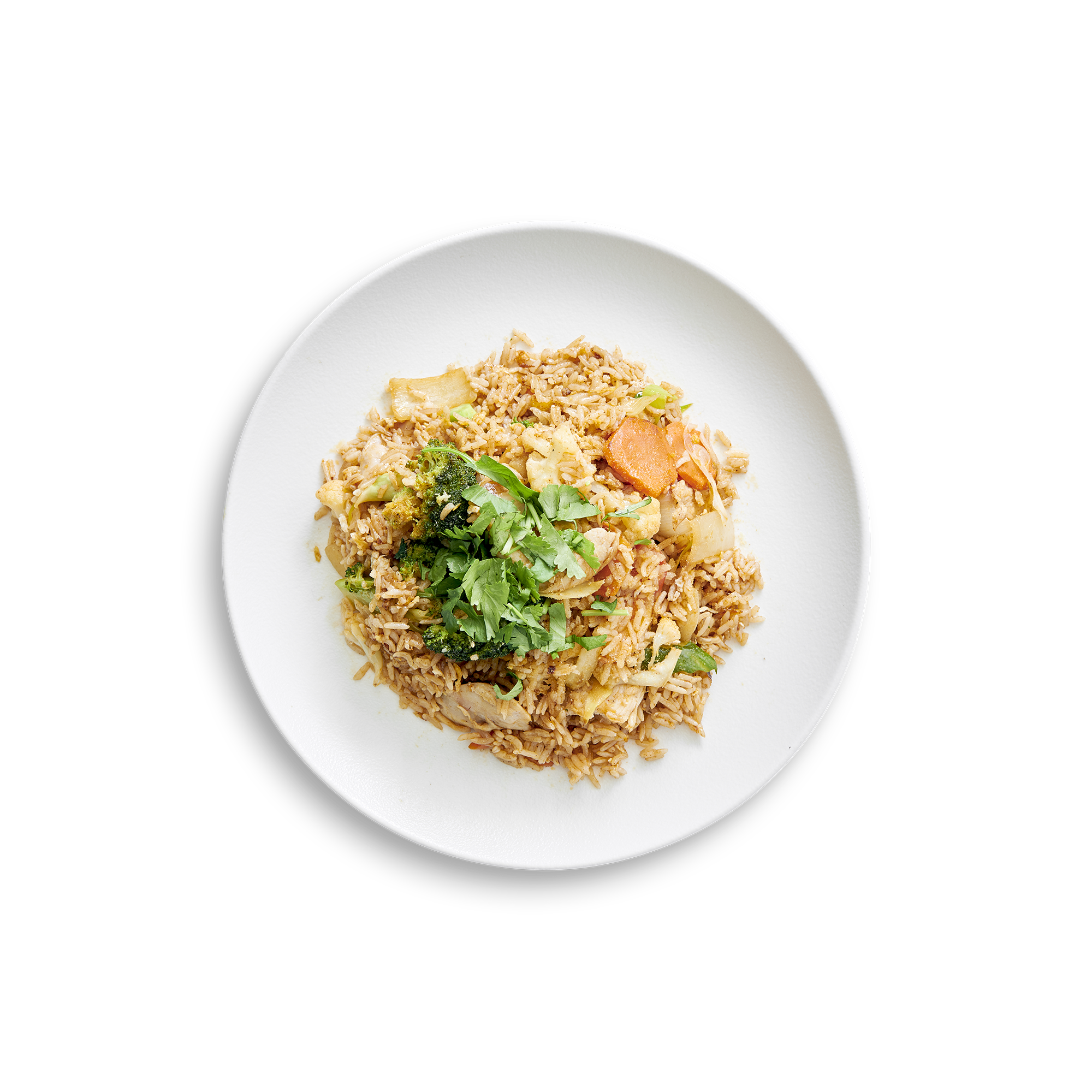Stegte ris med soya sauce, æg og grøntsager med kylling.