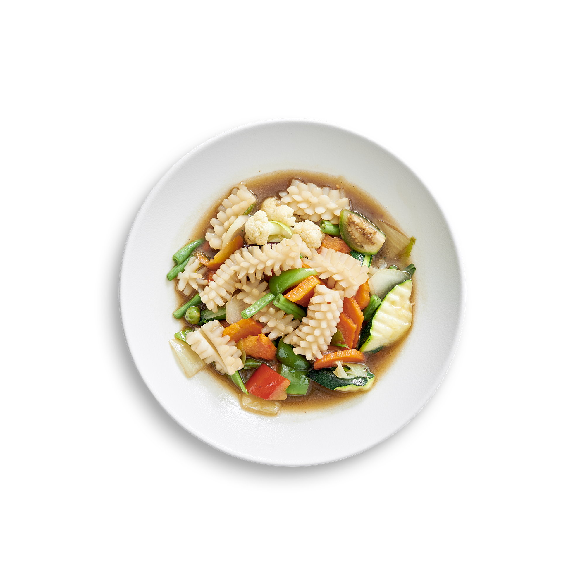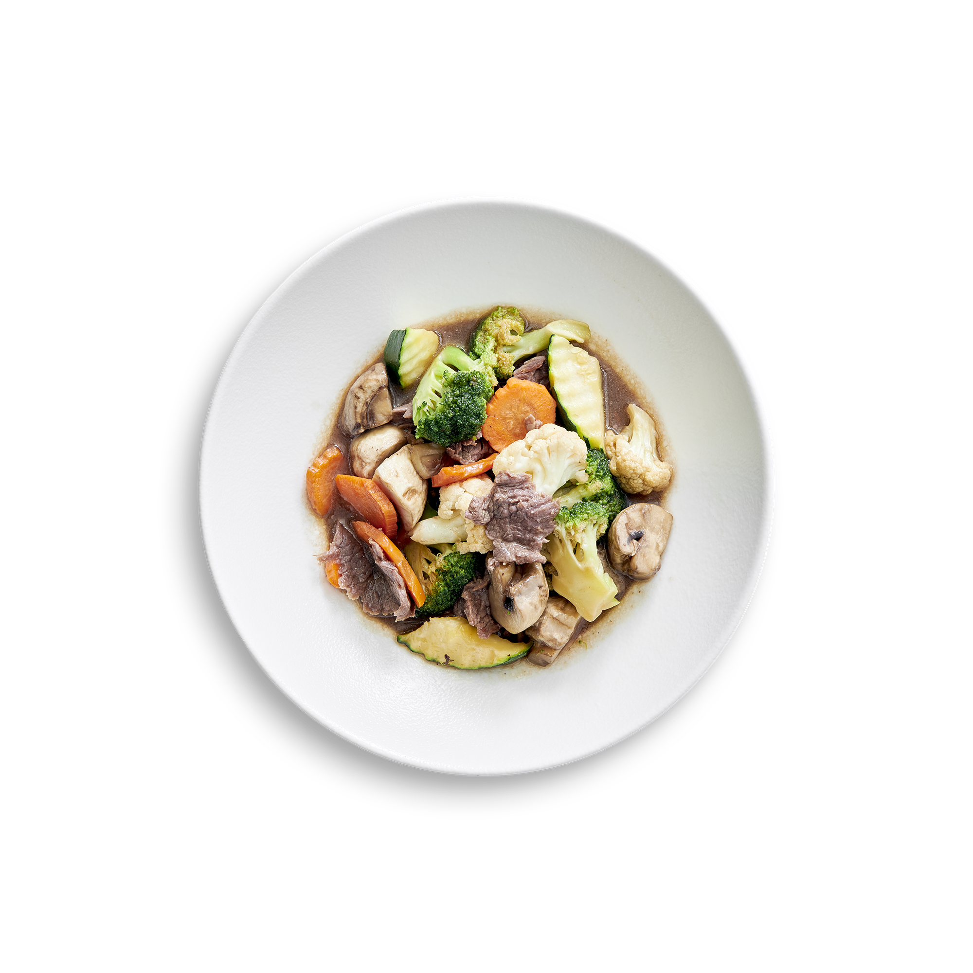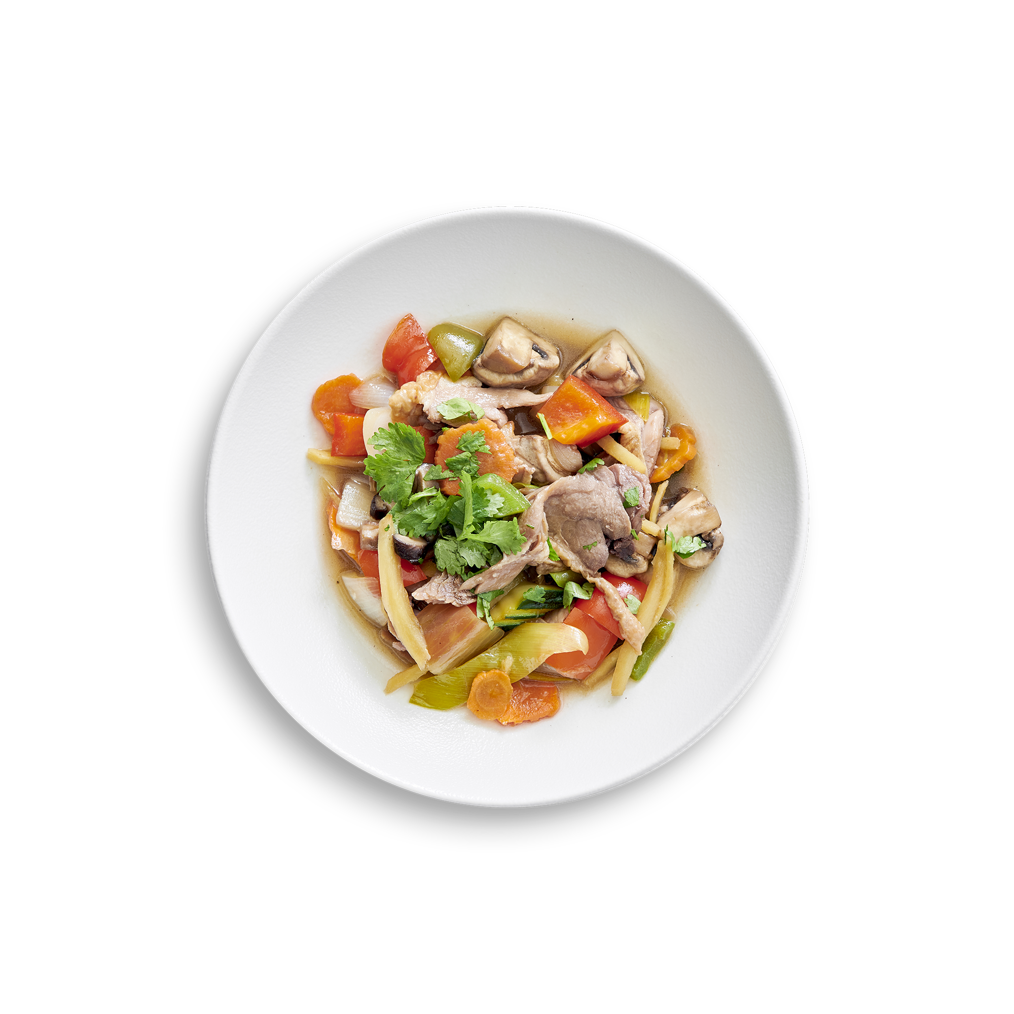 Stegte grøntsager med soya og svinekød. Serveres med ris.