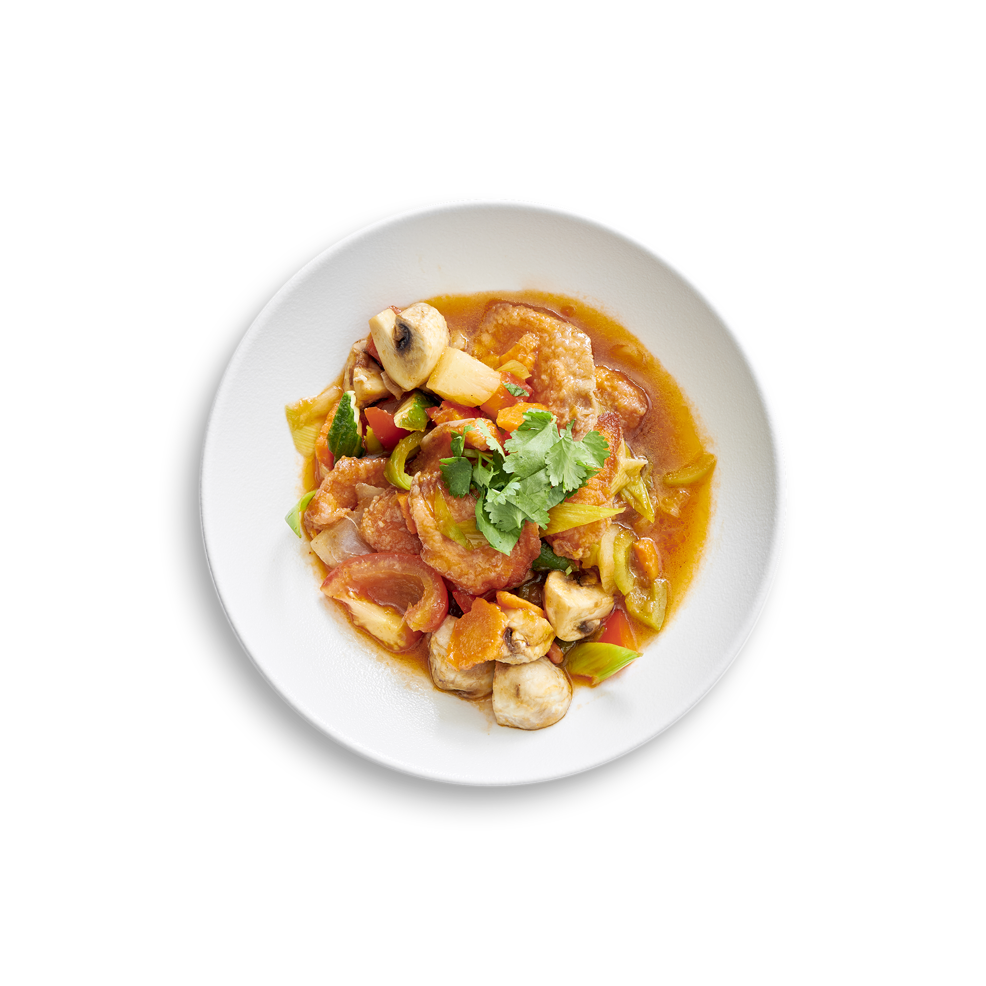 Stegte grøntsager i sursød sauce og koriander med and. Serveres med ris.