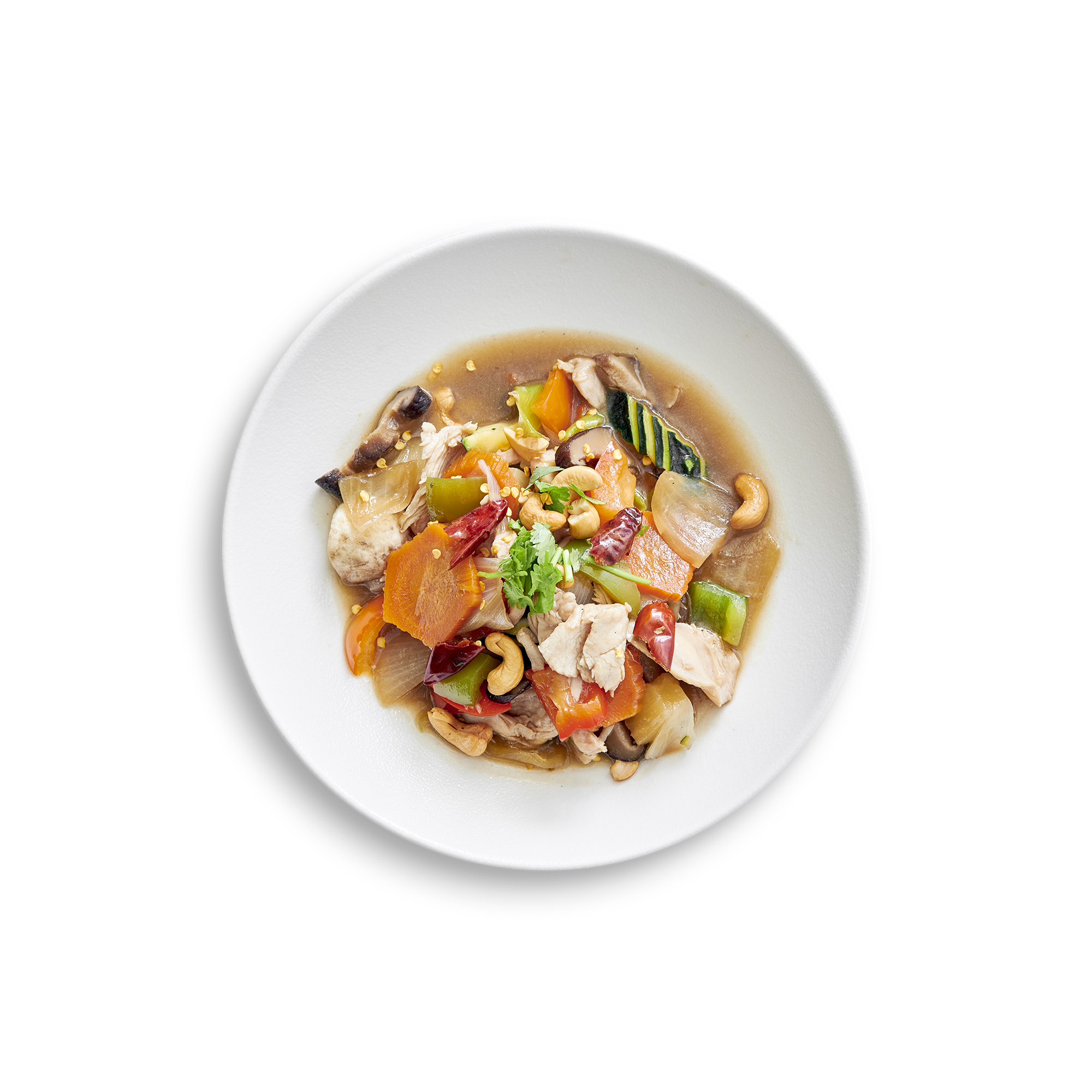 Tørret chili, friske løg og sprøde cashewnødder stegt med kylling.