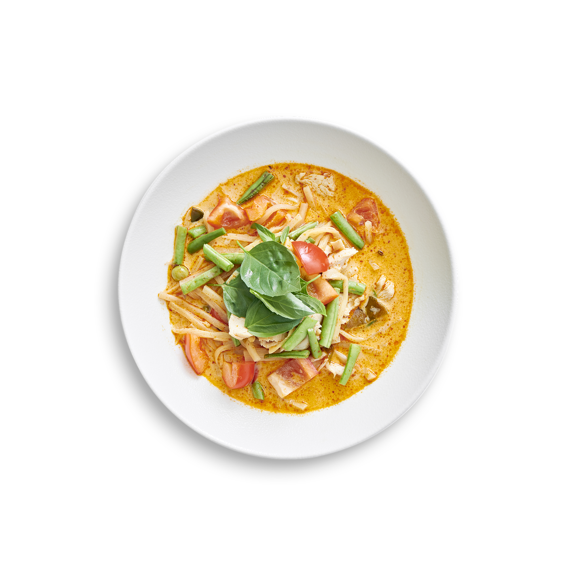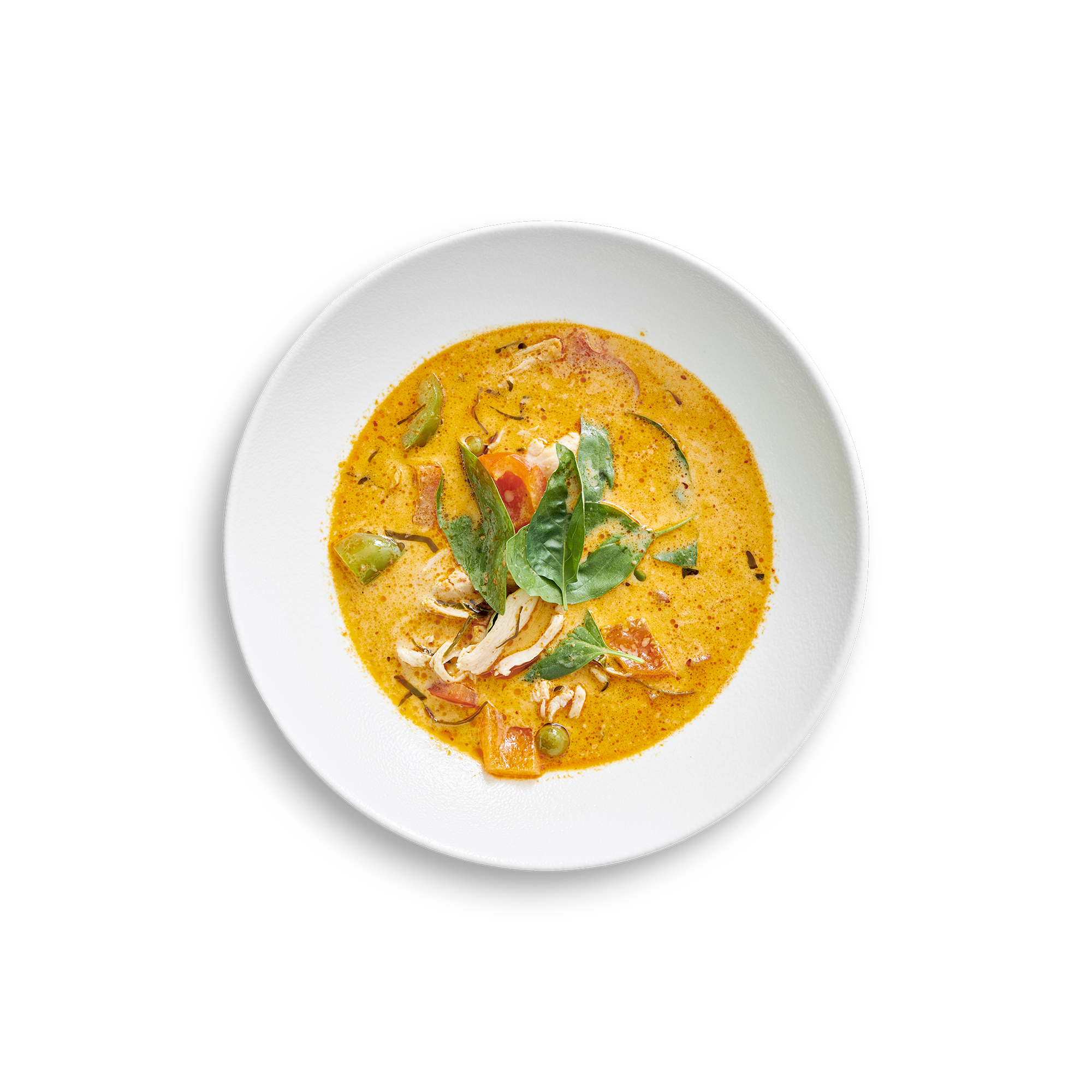 Rød karry, kokosmælk, basilikum og friske thailandske grøntsager med kylling.