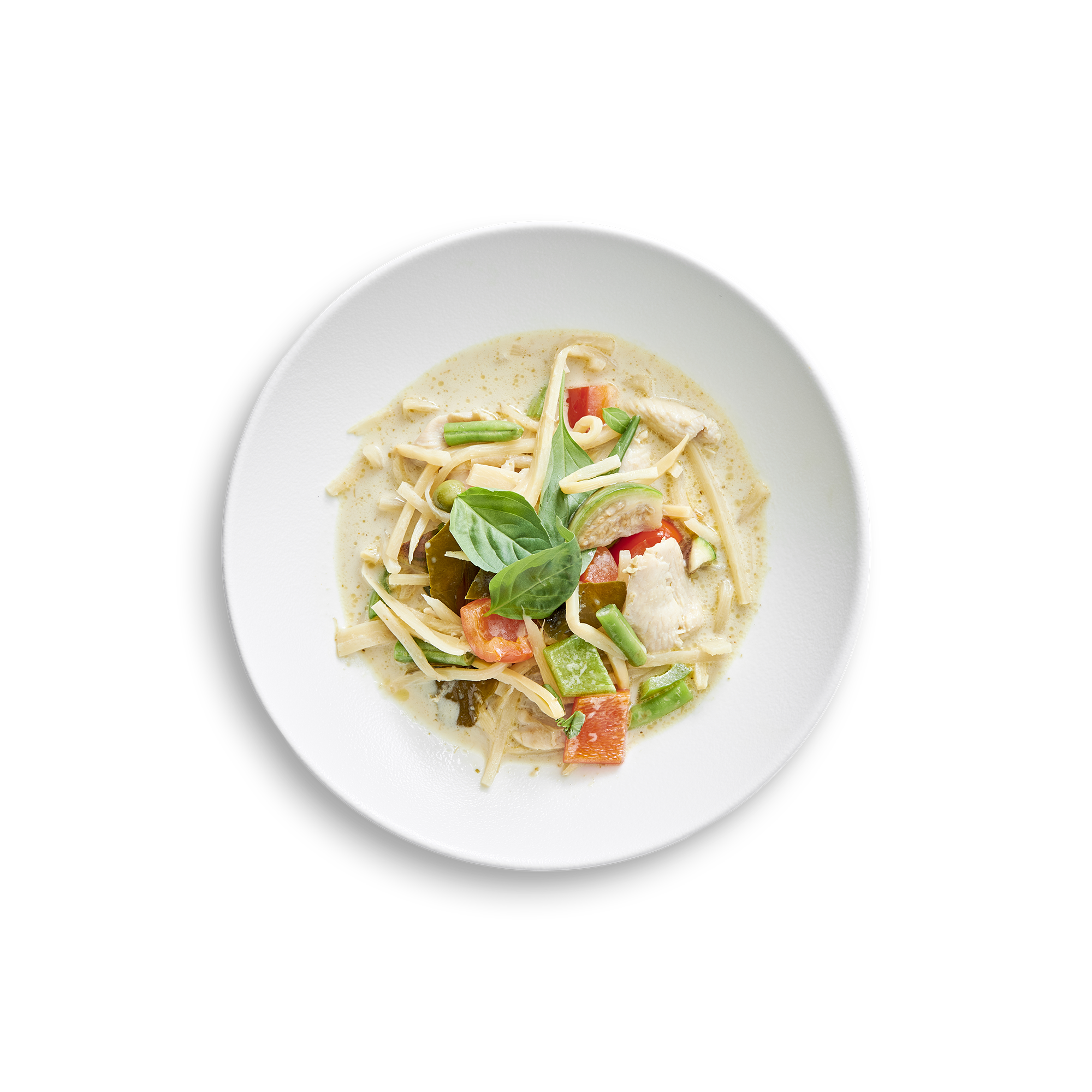 Kylling i grøn karry, kokosmælk, basilikum og thailandske bambusskud.