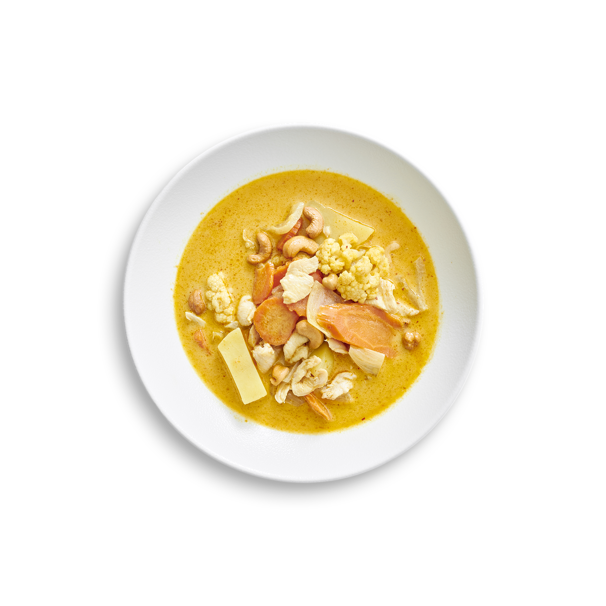 Kylling i kokosmælk, løg, gul karry, gulerødder og sprøde cashewnødder.