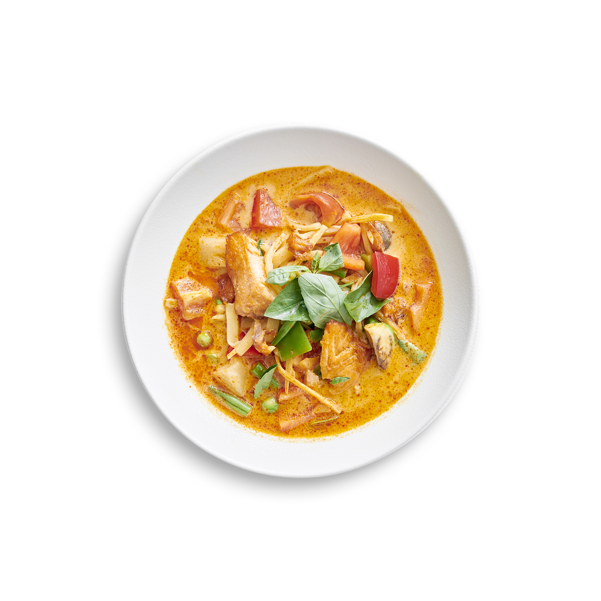 Laks med rød karry, basilikum, bambusskud og thailandske grøntsager. Serveres med ris.