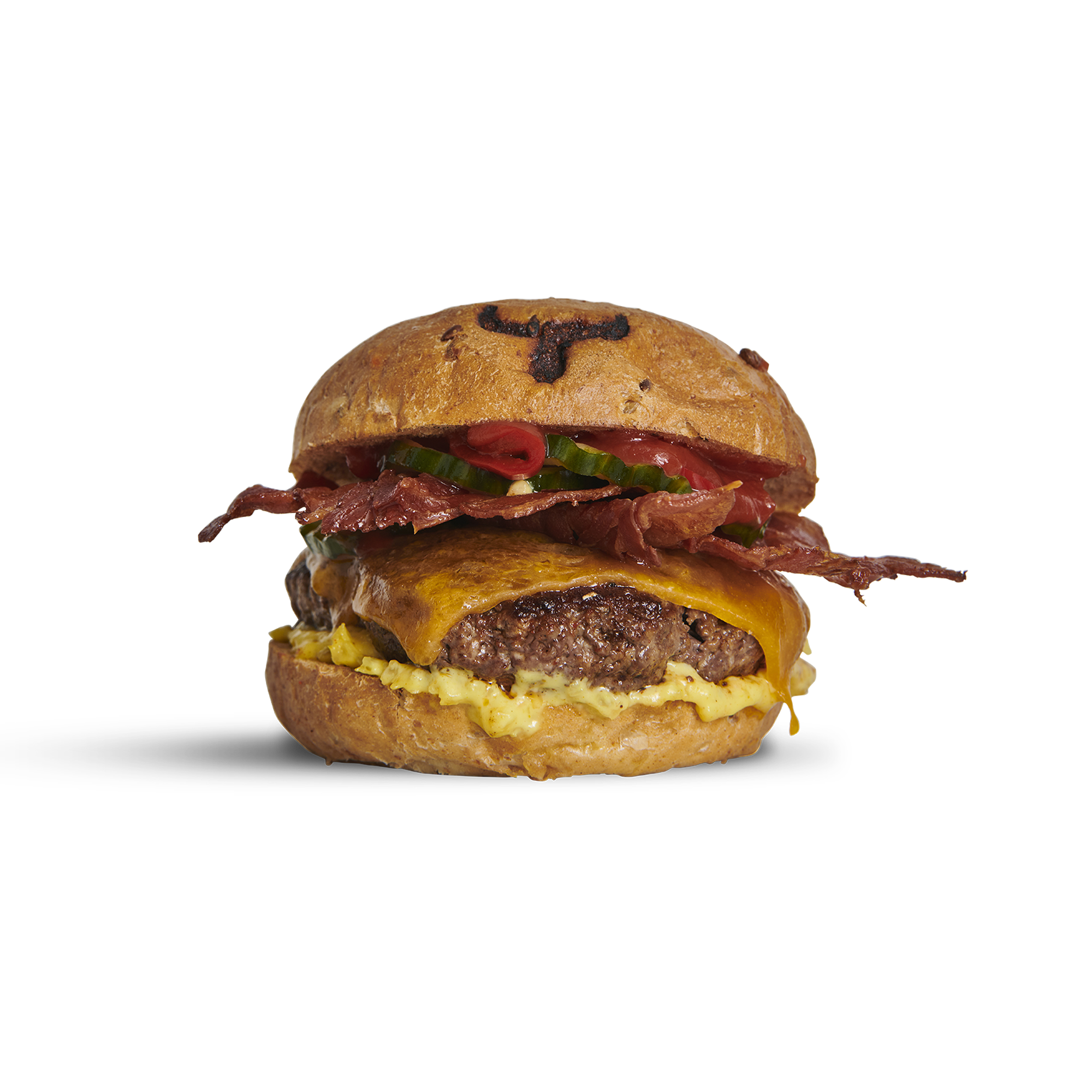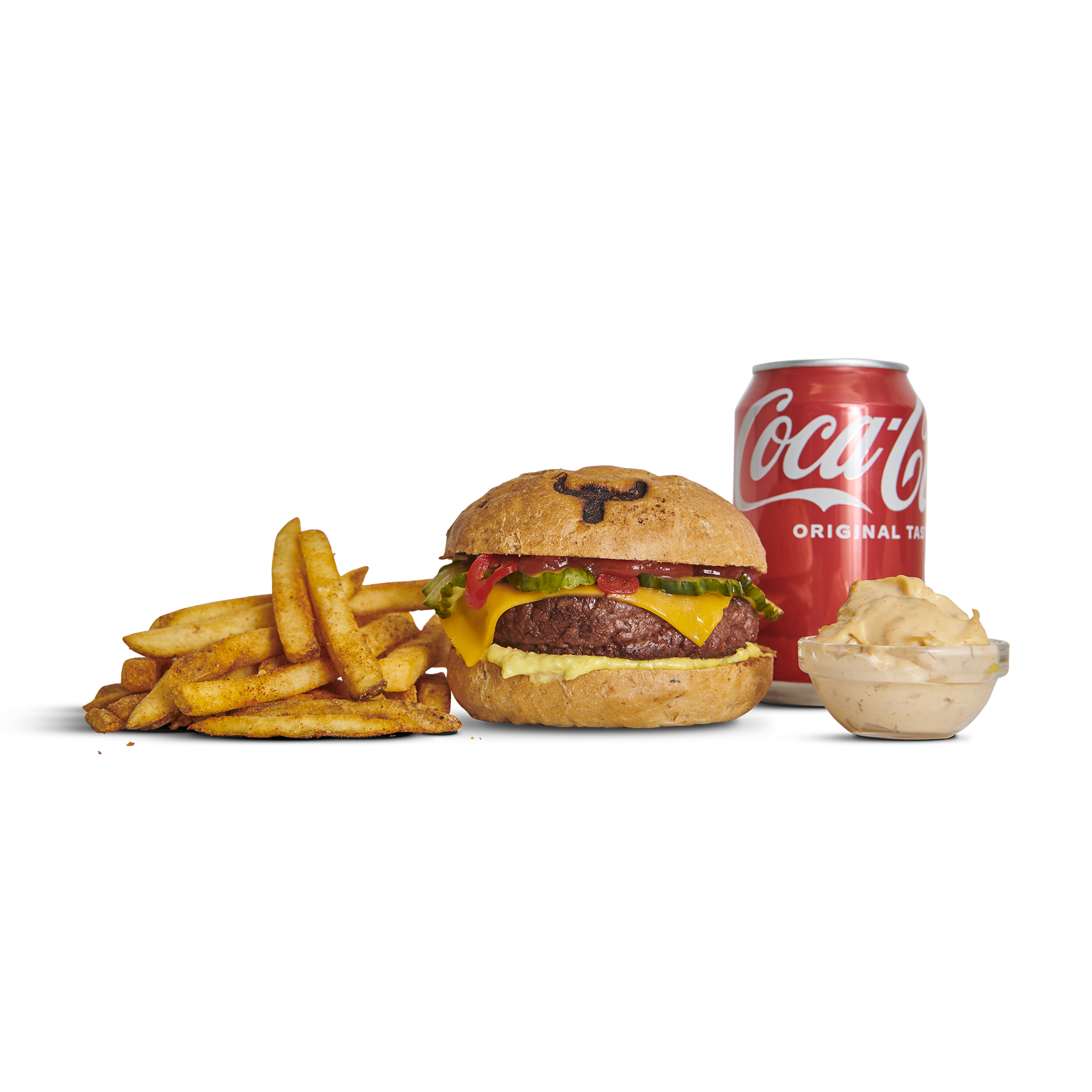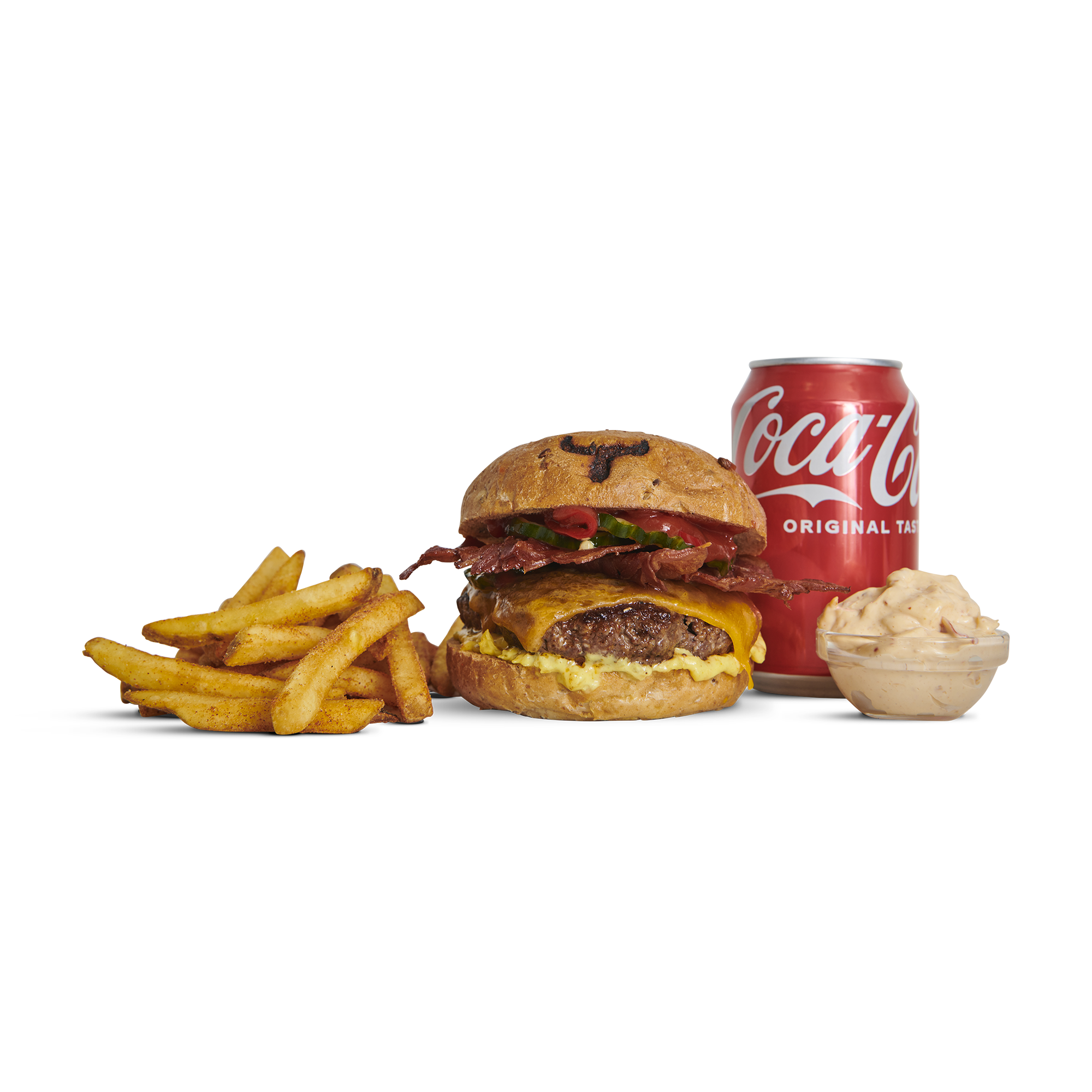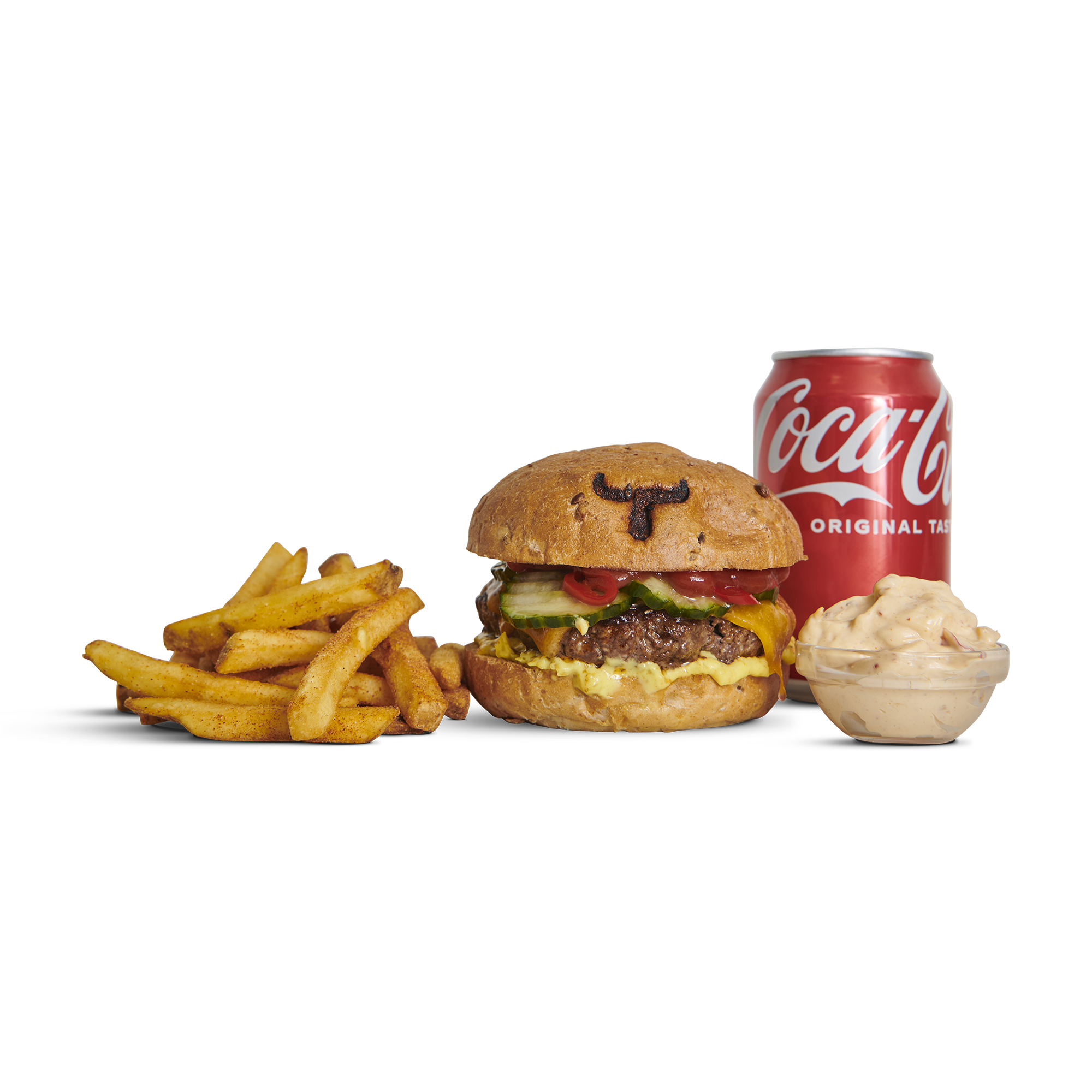 Stor hakkedreng af oksekød med bacon, cheddar, hjemmelavet agurkesalat, ketchup og remoulade.