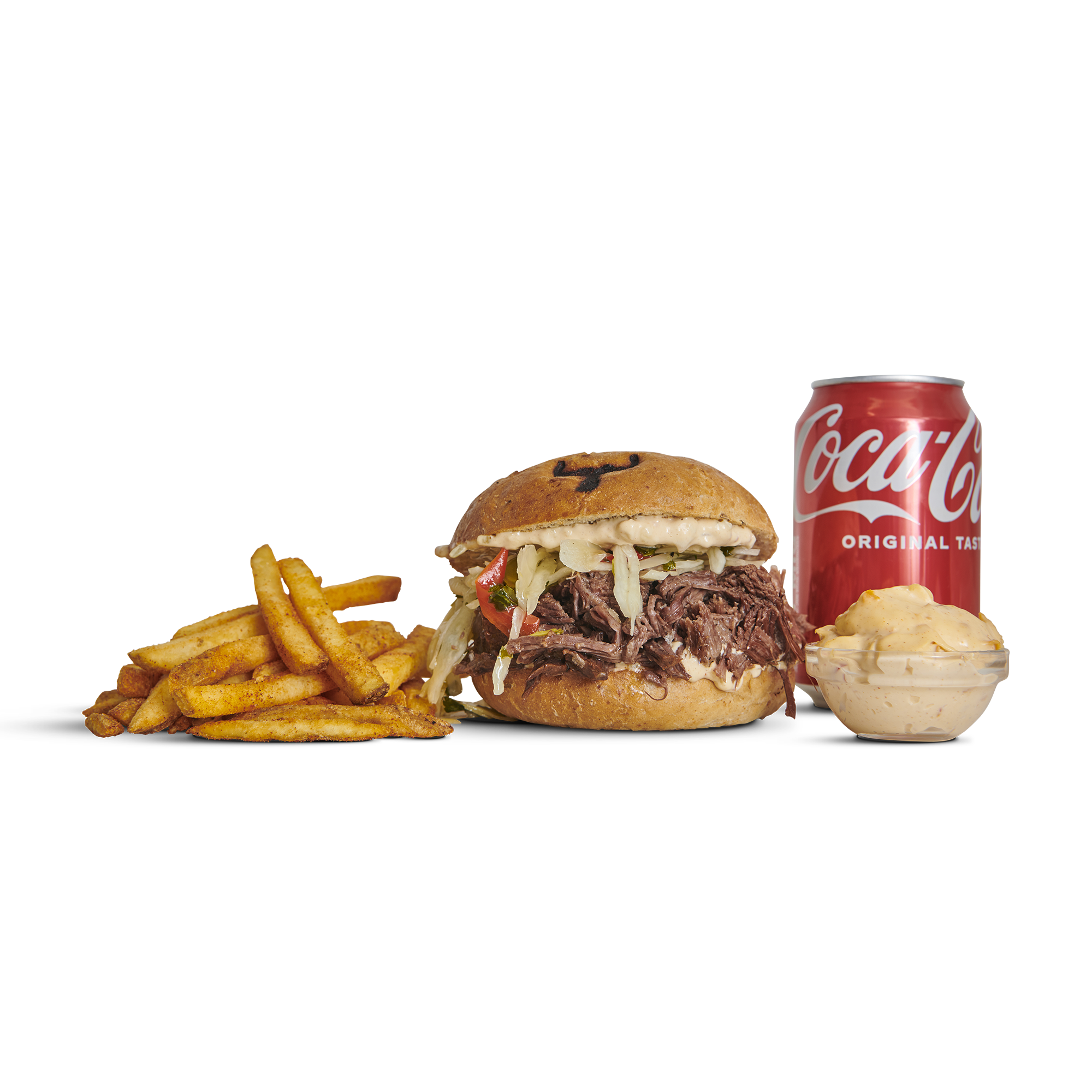 Langtidsstegt marineret pulled beef med frisk kålsalat, røget flagesalt og chiliremoulade.
