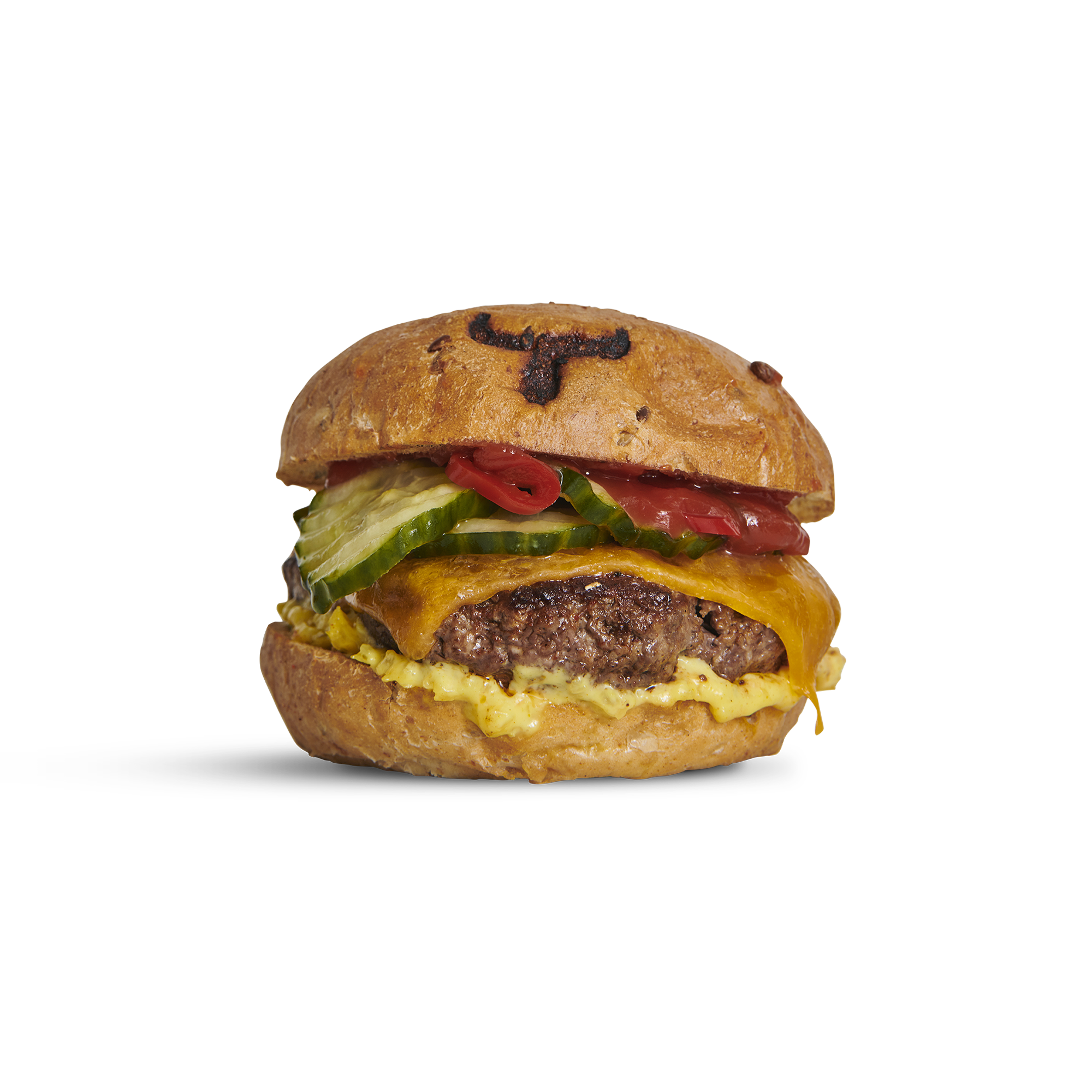 Stor hakkedreng af oksekød med cheddar, hjemmelavet agurkesalat, ketchup og remoulade.