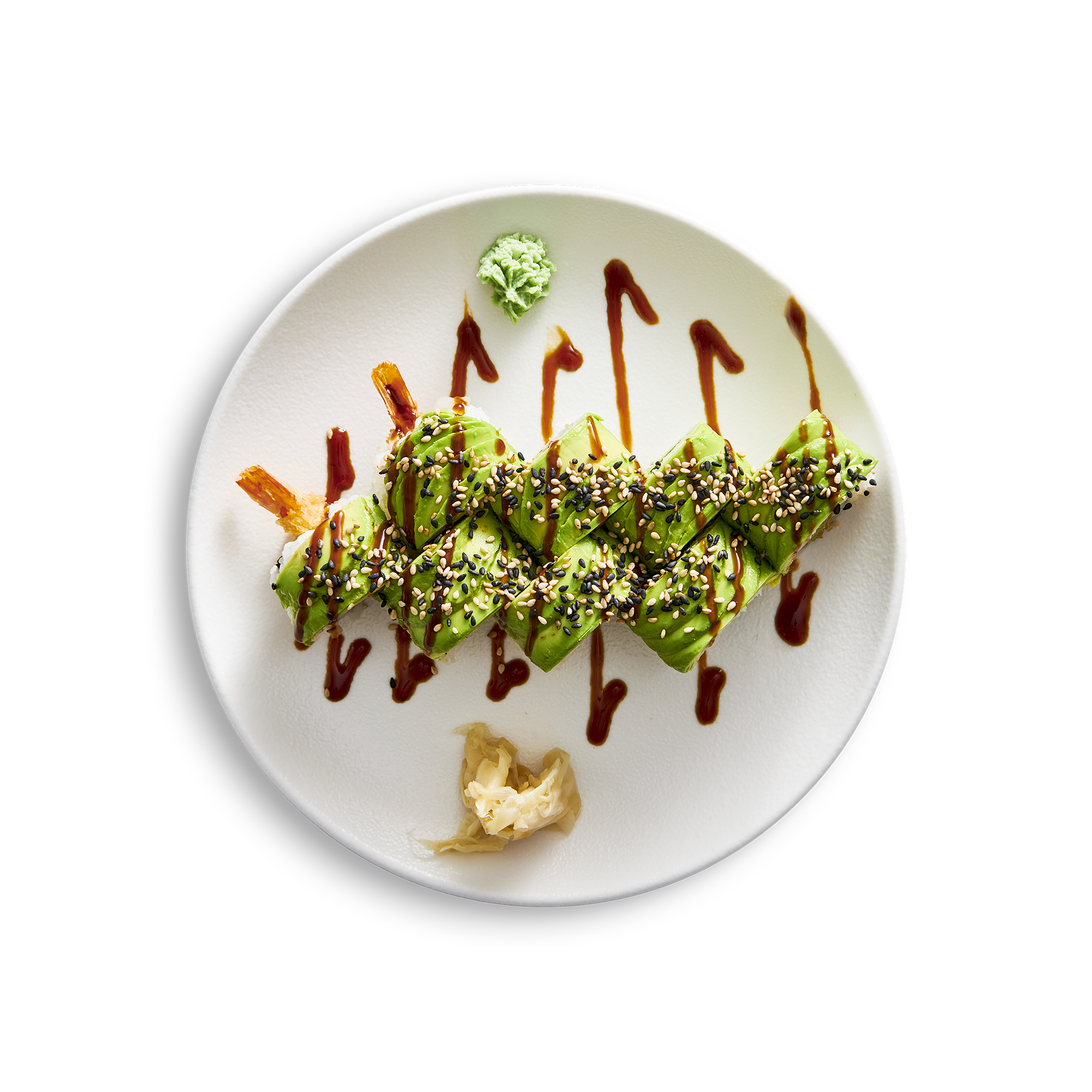 Dybstegt reje, agurk, avocado, chilimayo, toppet med avocado, teriyaki, sesam.