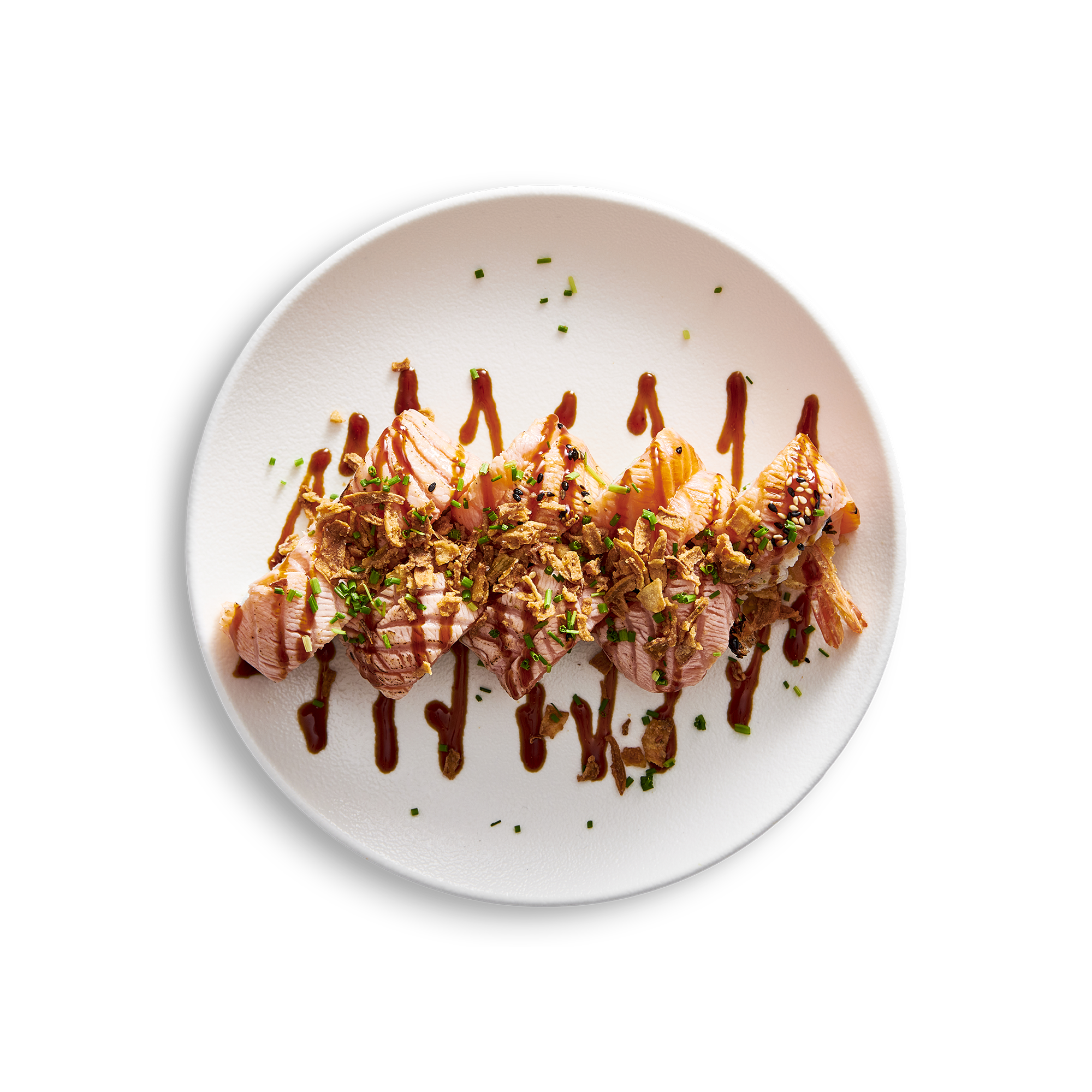 Dybstegt reje, agurk, avocado, chilimayo, toppet med flamberet laks, ristede løg, purløg og teriyaki.