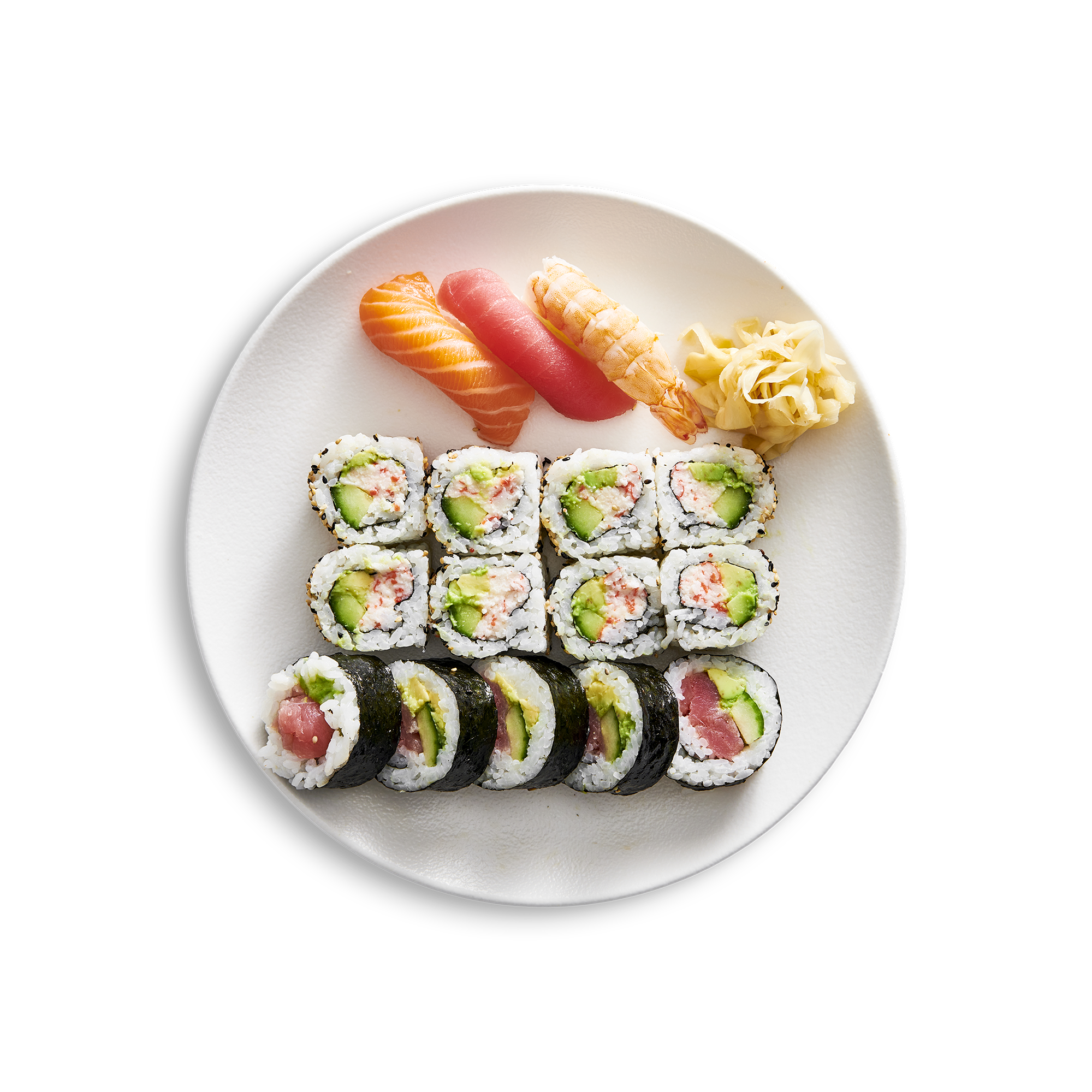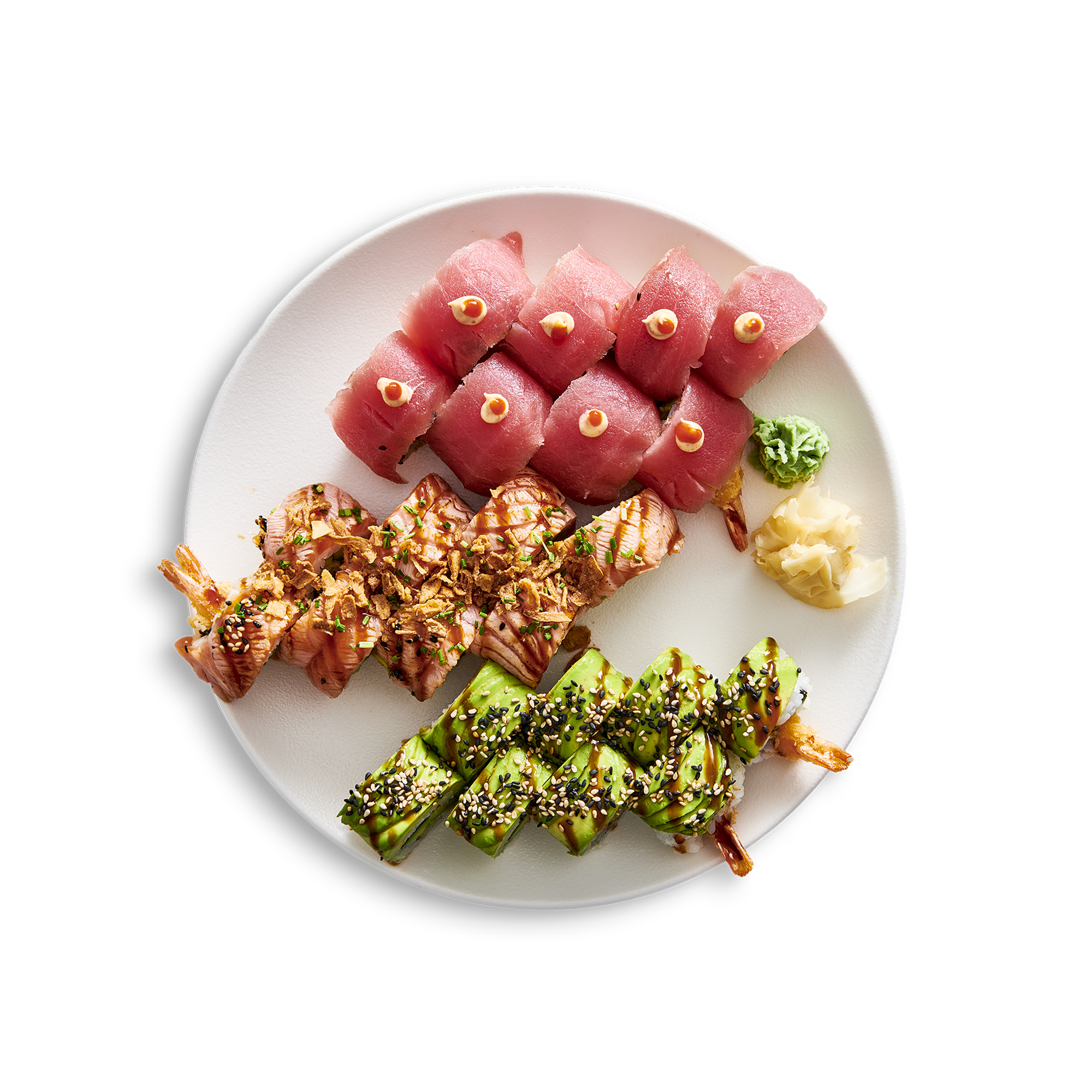 Surimi, agurk, avocado, toppet med laks, tun, rejer og avocado.