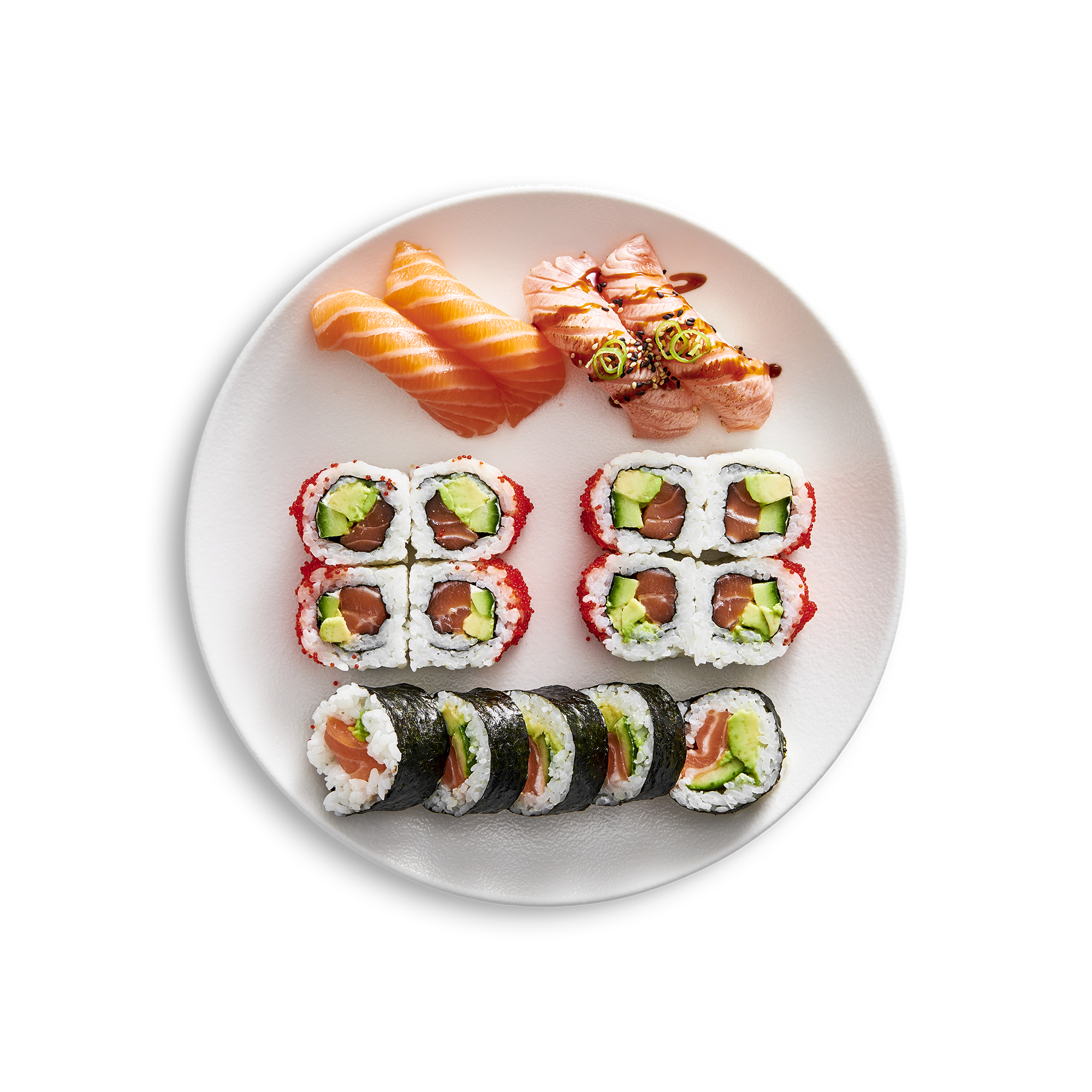 Nigiri:2 Laks, 2 Flammegrillet laks. Uramaki: 8 Laks uramaki. Futomaki: 5 Laks big.