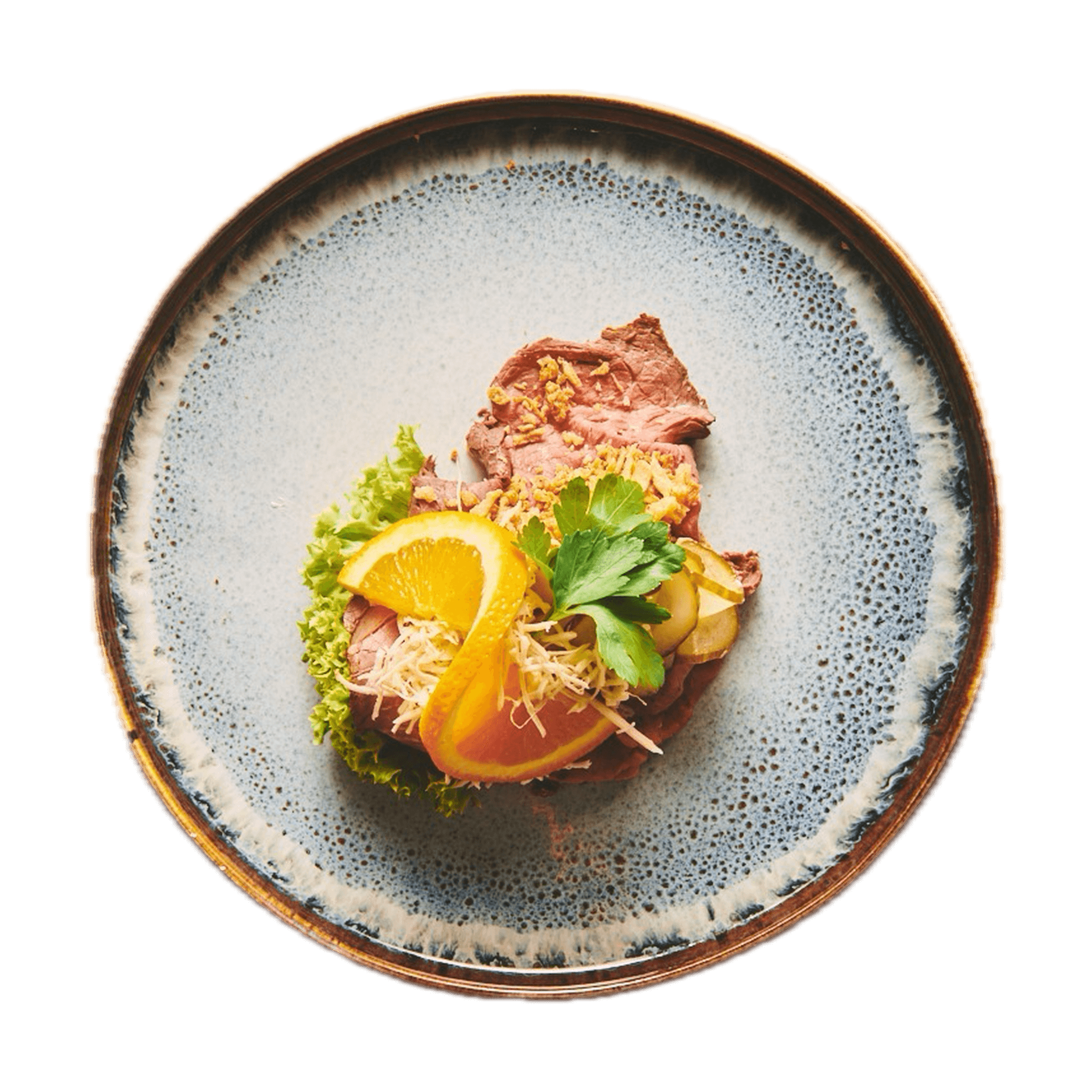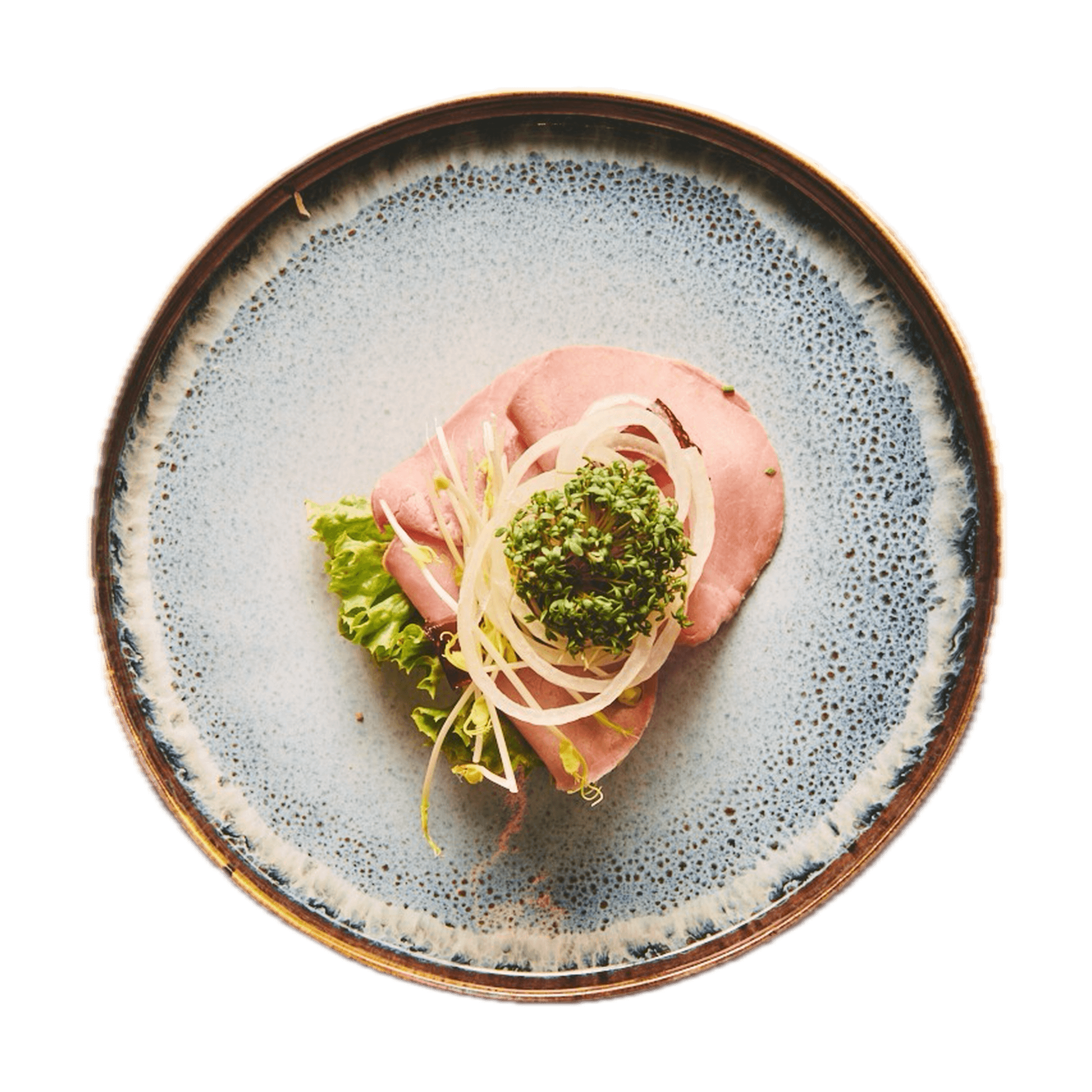 Roastbeef serveret på hjemmebagt rugbrød med remoulade & ristede løg