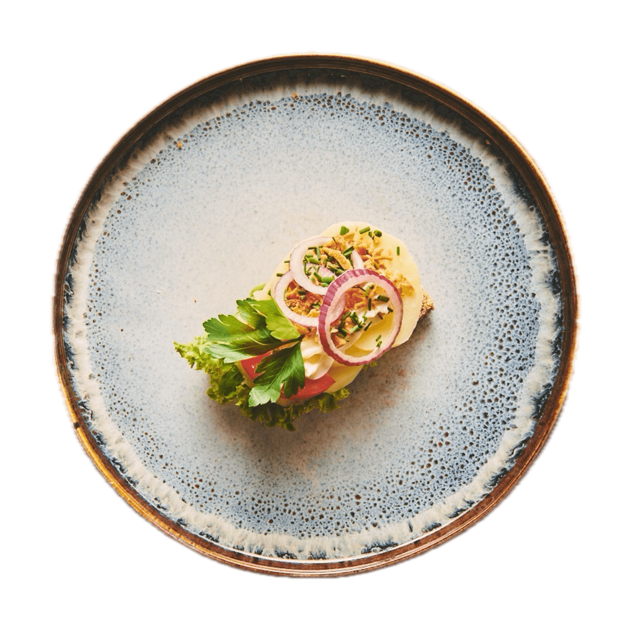 Kartoffel serveret på hjemmebagt rugbrød med ristede & rå løg
