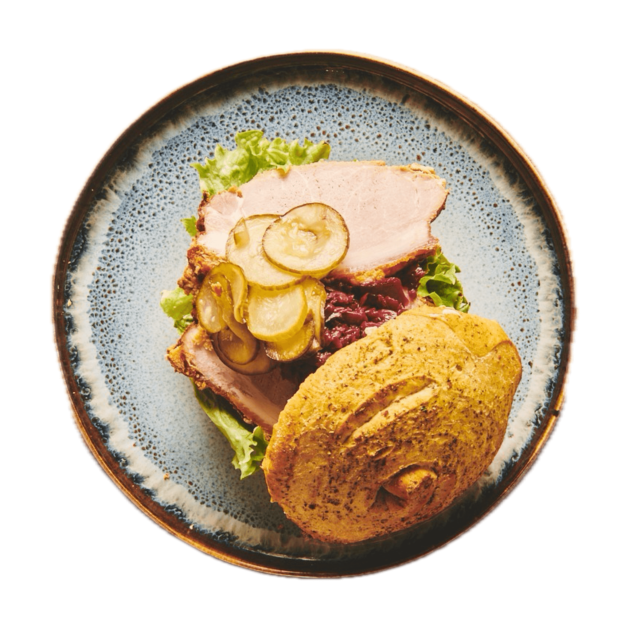 De kalder den byens bedste Flæskestegssandwich. Med alt det gode. Velvoksne skiver af rigtig flæskesteg fra nakkekam, samt sennepsdressing, rødkål & agurkesalat