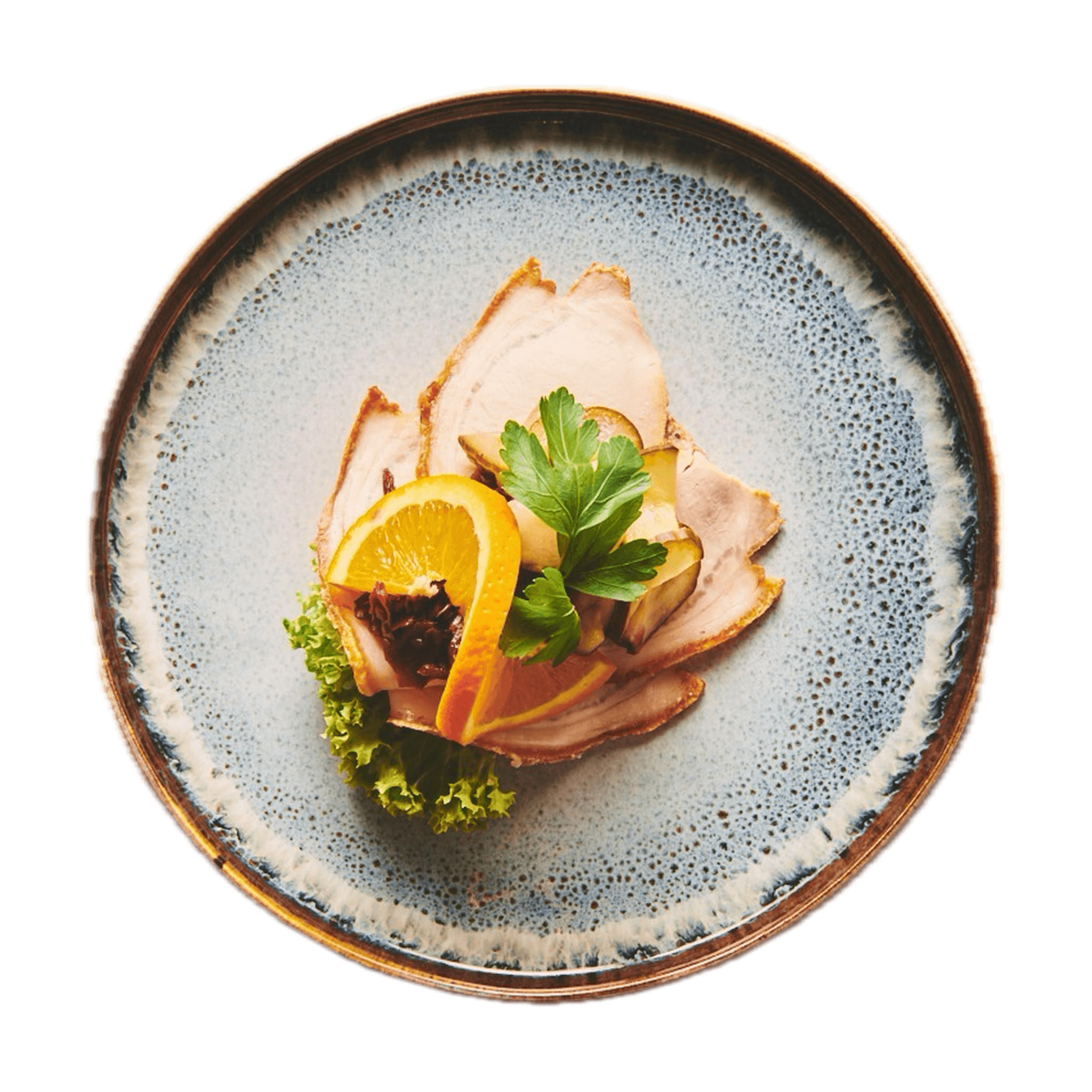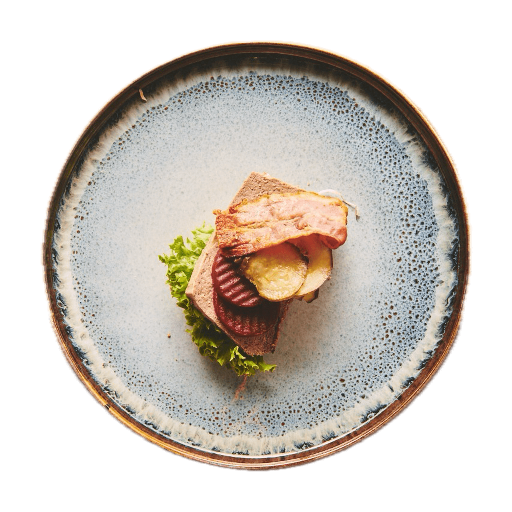 Flæskesteg serveret på hjemmebagt rugbrød med rødkål & surt