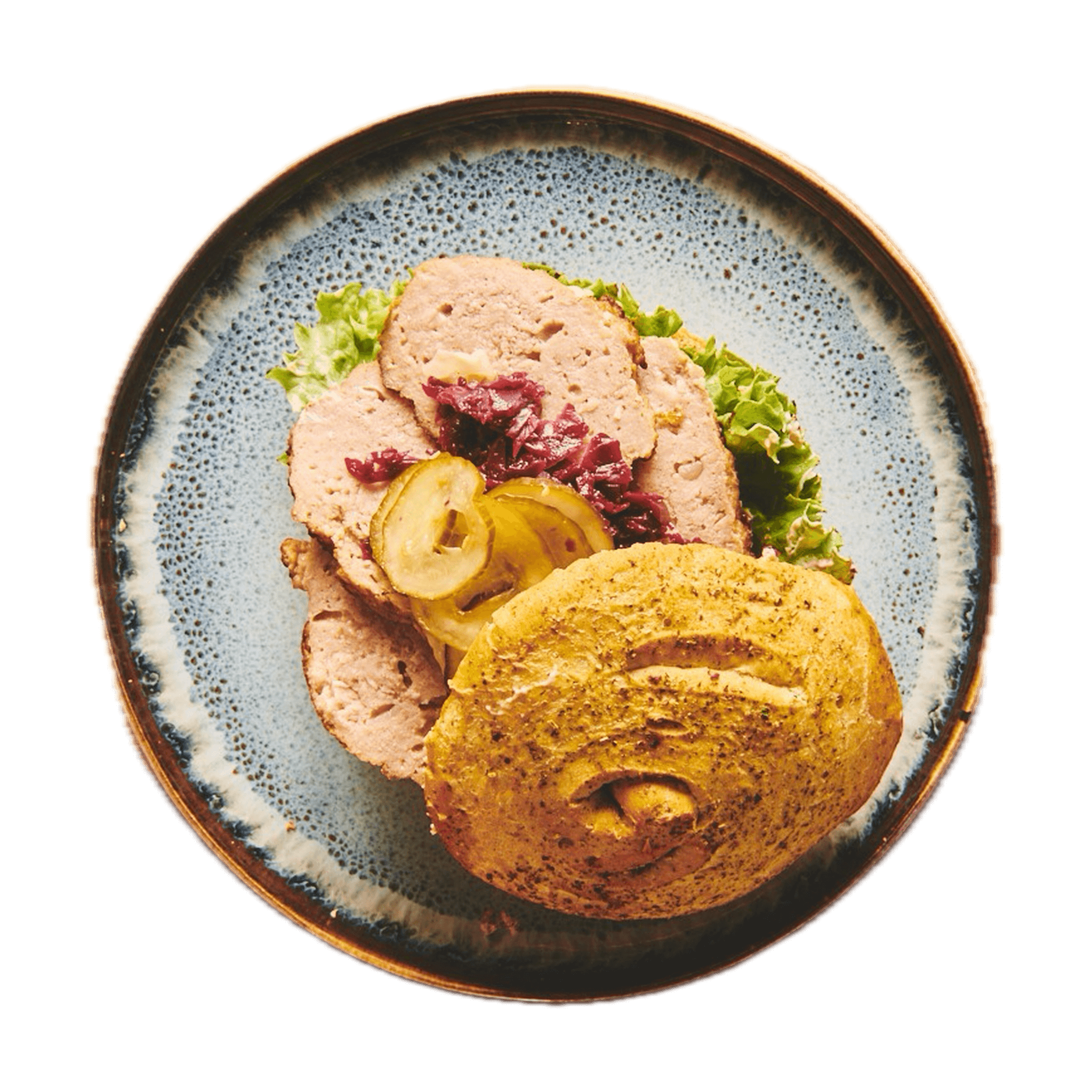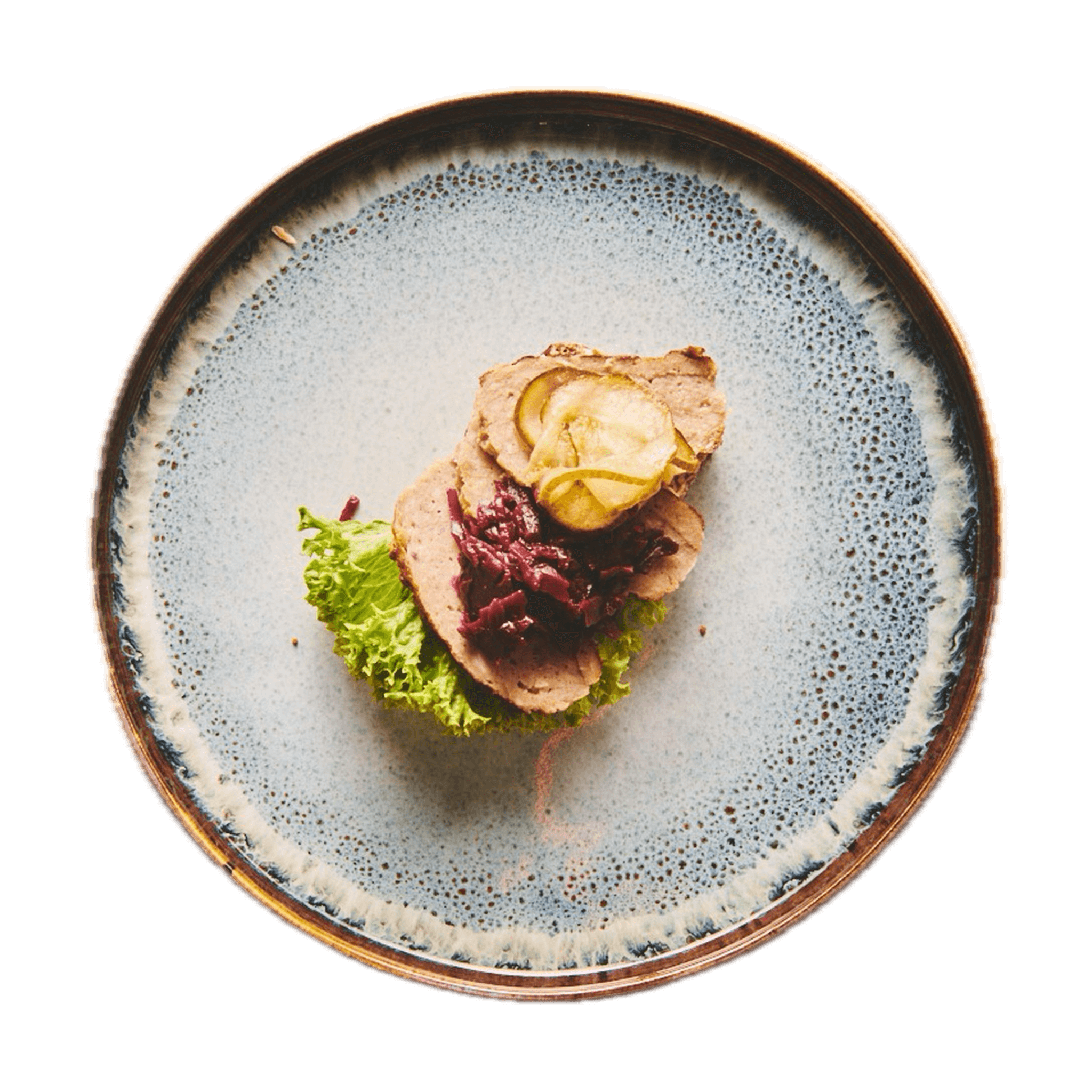 Frikadelle serveret på hjemmebagt rugbrød med rødkål & surt